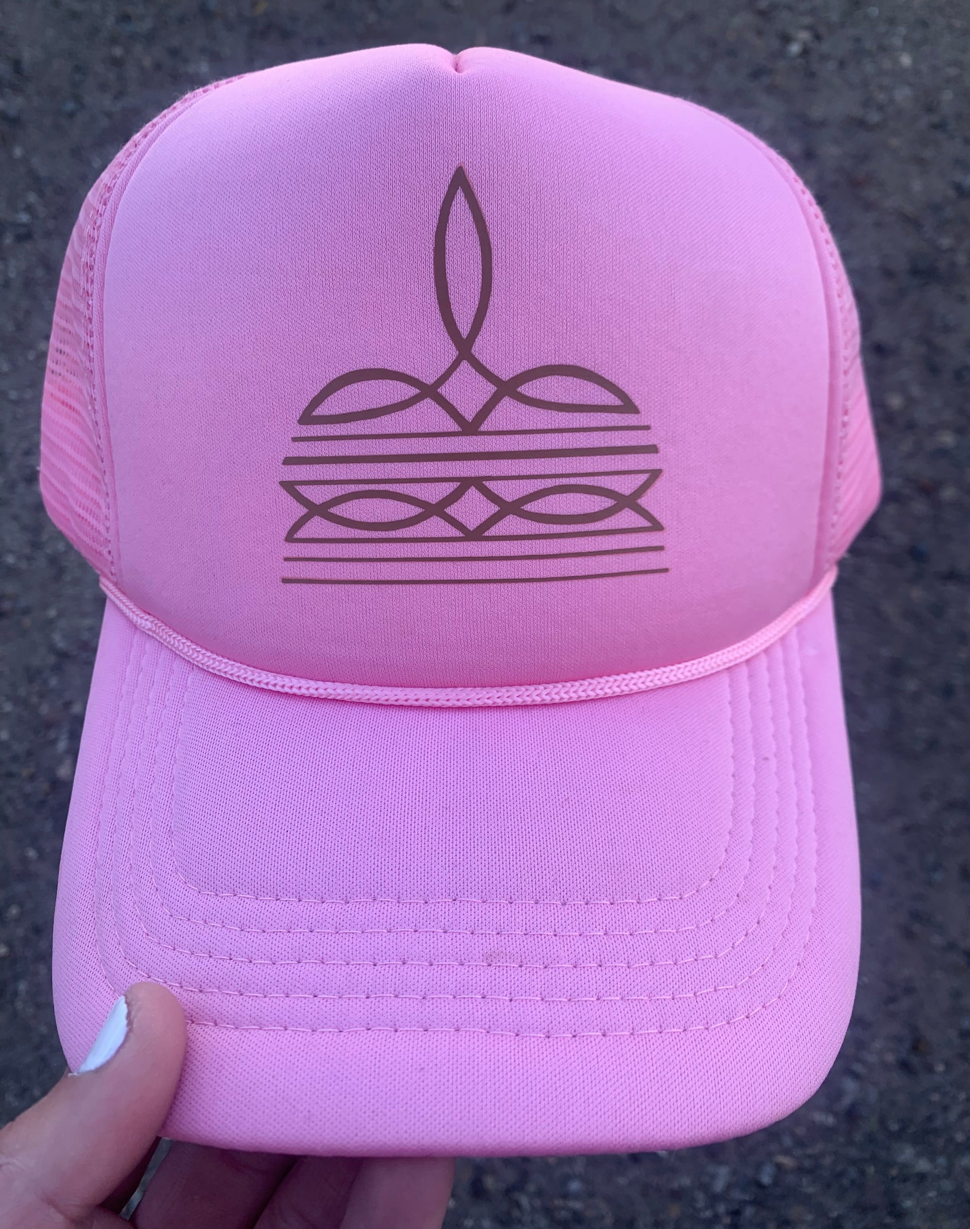 Brown Bootstitch design on a Pink Foam Front Trucker Hat. Adjustable mesh back. Mid profile.