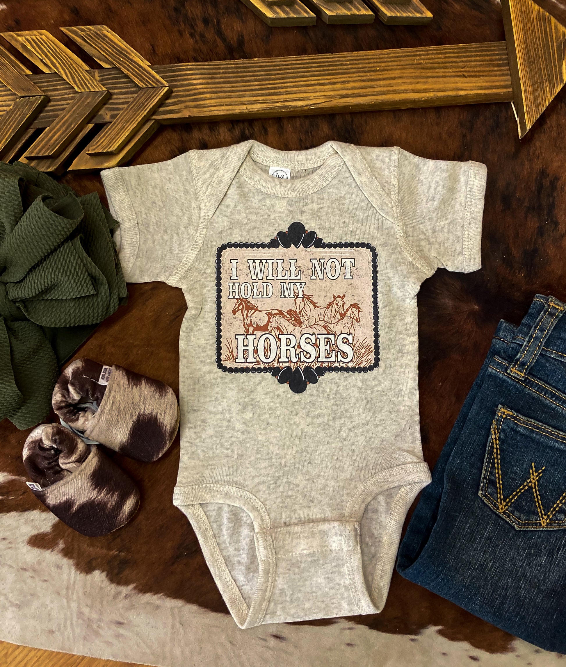 Cutest little “I Will Not Hold My Horses” Graphic on a soft oatmeal colored onesie. Snap closure.