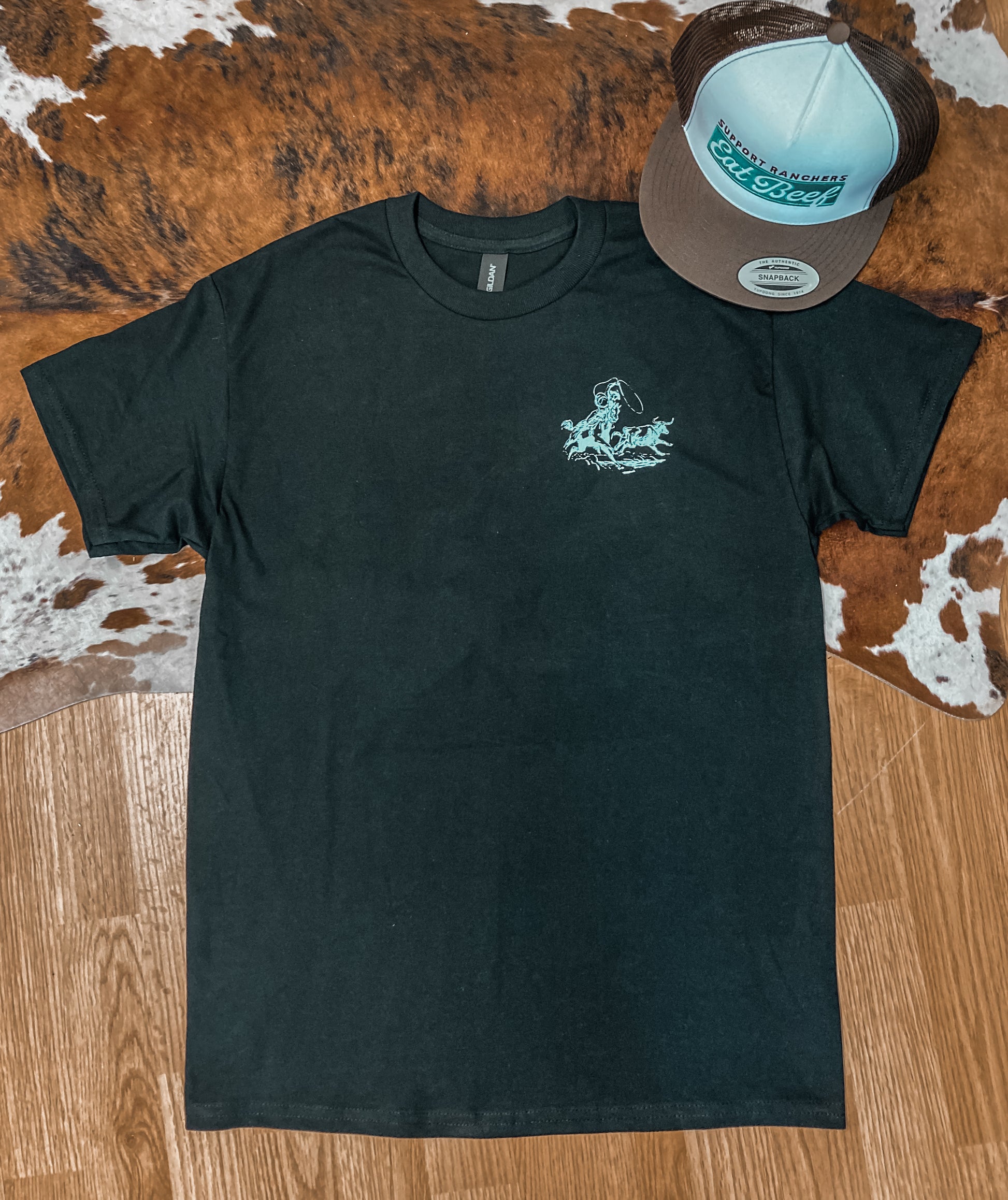 Coolest “Mean As Hell” Cowboy roping a Maverick Graphic on a soft Black Tee. White front pocket graphic & white back western graphic w/wording.