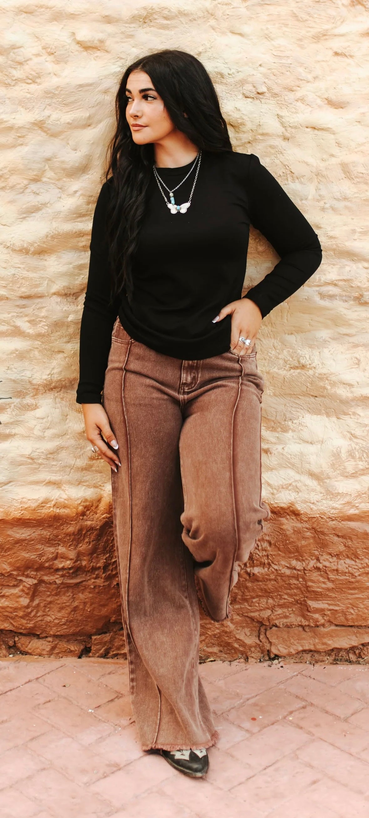 oooohh these WHISTLE BRITCHES are HOT!!! 🔥High rise, wide-leg, vintage wash chocolate colored denim. you got the seam down the middle + raw hem at the bottom.